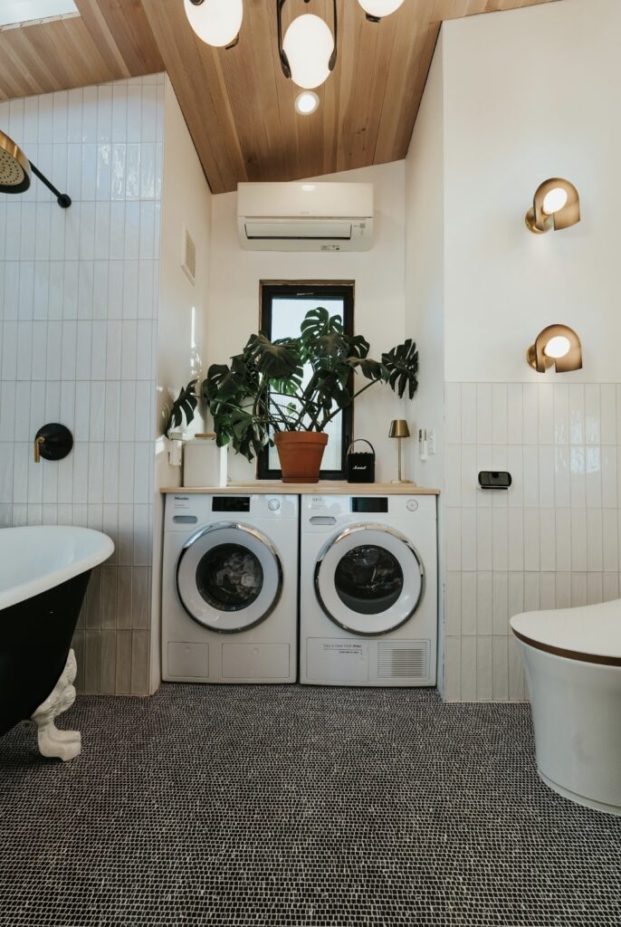 • In our Living Room Tiny House, the bump-out in the bathroom is perfectly sized for a washer/dryer unit.